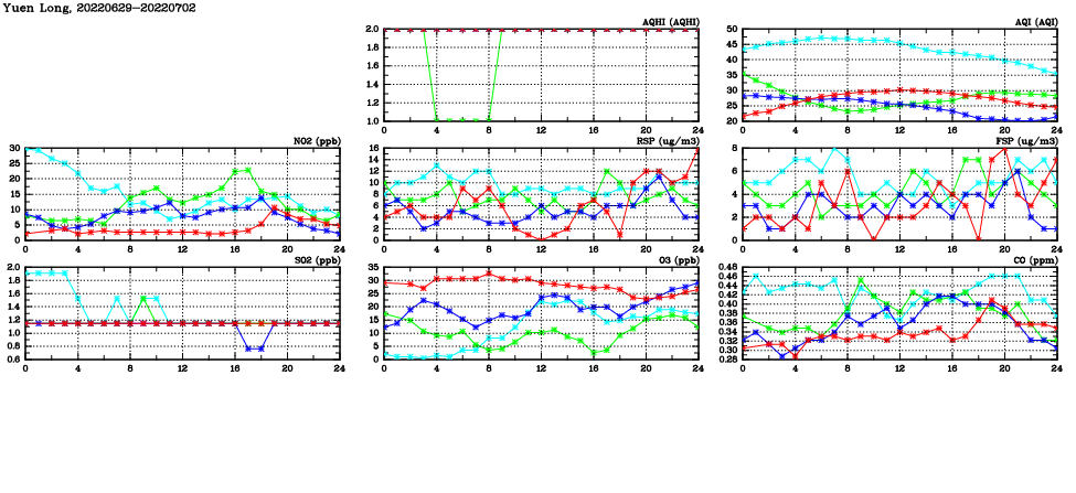| Air Quality Data Time Series in Yuen Long (2022/07/02) | ( Line colors: Day -3 Day -2 Day -1 Current day ) | 2D Map Current AQHI |