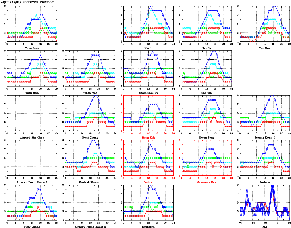| Air Quality Data Time Series for AQHI (2022/08/01) | ( Line colors: Day -3 Day -2 Day -1 Current day ) | 2D Map Current AQHI |