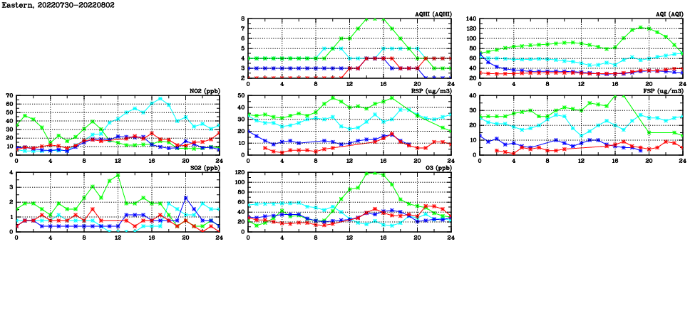 | Air Quality Data Time Series in Eastern (2022/08/02) | ( Line colors: Day -3 Day -2 Day -1 Current day ) | 2D Map Current AQHI |