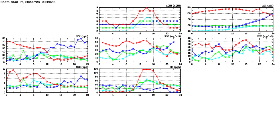 | Air Quality Data Time Series in Sham Shui Po (2022/07/31) | ( Line colors: Day -3 Day -2 Day -1 Current day ) | 2D Map Current AQHI |