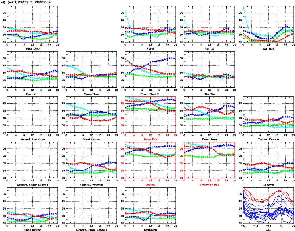 | Air Quality Data Time Series for AQI (2022/08/04) | ( Line colors: Day -3 Day -2 Day -1 Current day ) | 2D Map Current AQHI |