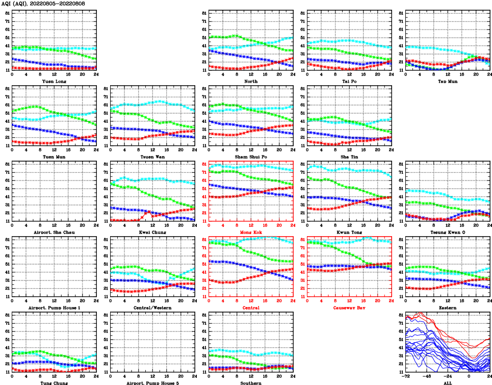 | Air Quality Data Time Series for AQI (2022/08/08) | ( Line colors: Day -3 Day -2 Day -1 Current day ) | 2D Map Current AQHI |
