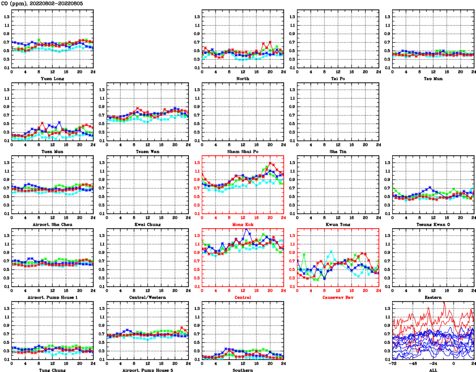 | Air Quality Data Time Series for CO (2022/08/05) | ( Line colors: Day -3 Day -2 Day -1 Current day ) | 2D Map Current AQHI |