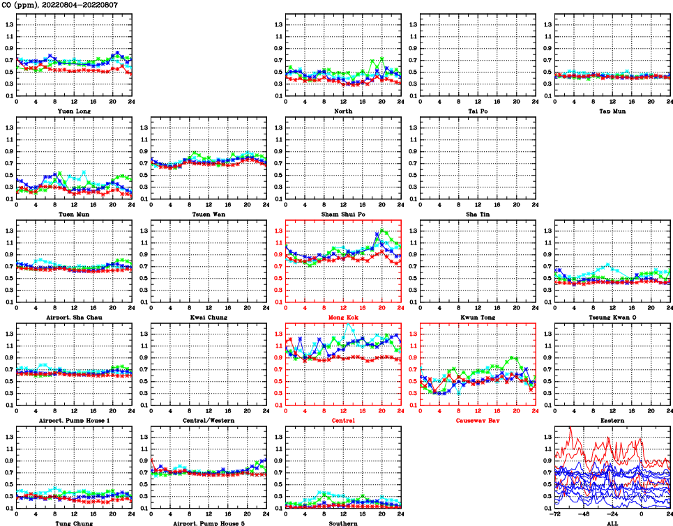 | Air Quality Data Time Series for CO (2022/08/07) | ( Line colors: Day -3 Day -2 Day -1 Current day ) | 2D Map Current AQHI |