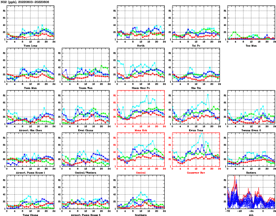 | Air Quality Data Time Series for NO2 (2022/08/06) | ( Line colors: Day -3 Day -2 Day -1 Current day ) | 2D Map Current AQHI |