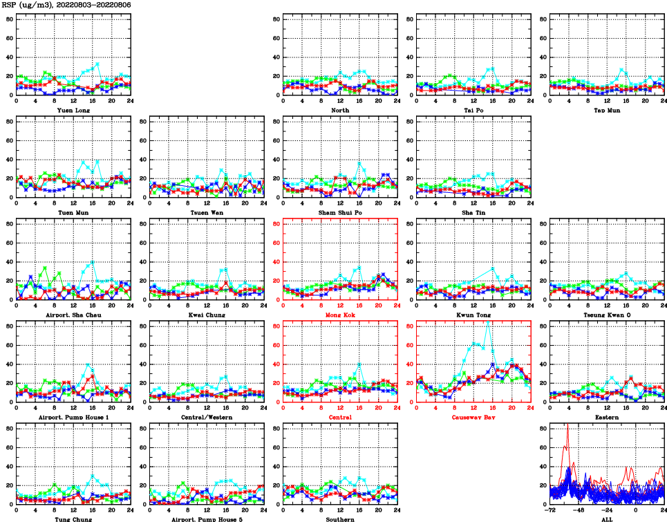 | Air Quality Data Time Series for RSP (2022/08/06) | ( Line colors: Day -3 Day -2 Day -1 Current day ) | 2D Map Current AQHI |