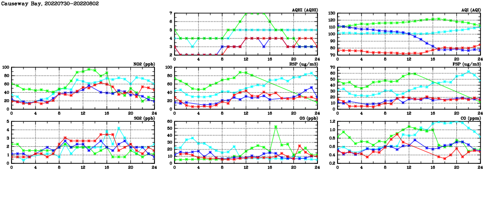 | Air Quality Data Time Series in Causeway Bay (2022/08/02) | ( Line colors: Day -3 Day -2 Day -1 Current day ) | 2D Map Current AQHI |