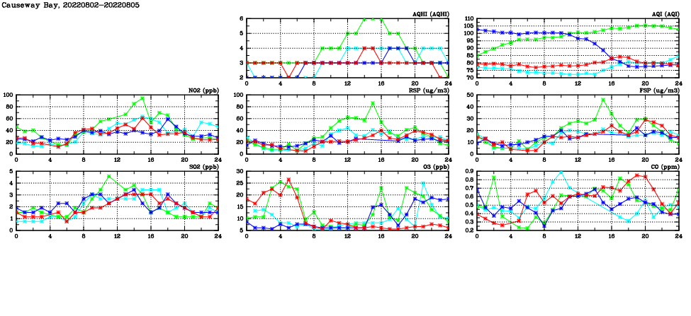 | Air Quality Data Time Series in Causeway Bay (2022/08/05) | ( Line colors: Day -3 Day -2 Day -1 Current day ) | 2D Map Current AQHI |