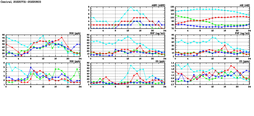 | Air Quality Data Time Series in Central (2022/08/03) | ( Line colors: Day -3 Day -2 Day -1 Current day ) | 2D Map Current AQHI |