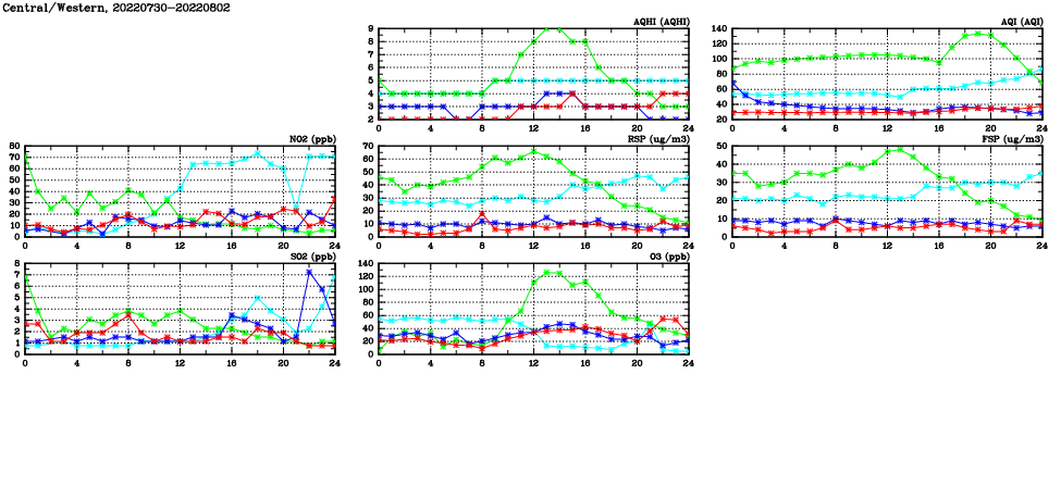 | Air Quality Data Time Series in Central/Western (2022/08/02) | ( Line colors: Day -3 Day -2 Day -1 Current day ) | 2D Map Current AQHI |