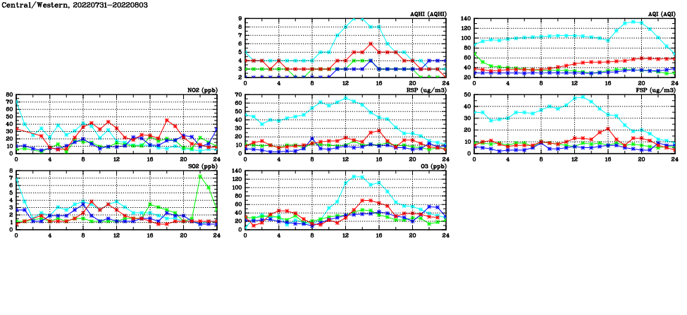 | Air Quality Data Time Series in Central/Western (2022/08/03) | ( Line colors: Day -3 Day -2 Day -1 Current day ) | 2D Map Current AQHI |