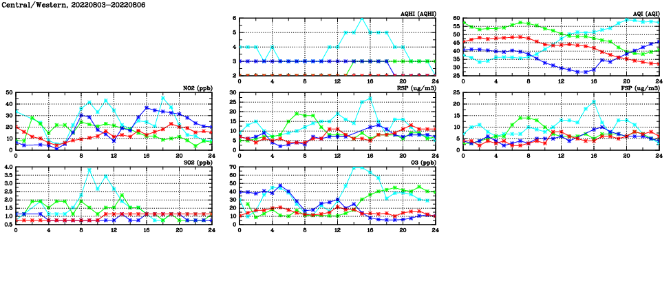 | Air Quality Data Time Series in Central/Western (2022/08/06) | ( Line colors: Day -3 Day -2 Day -1 Current day ) | 2D Map Current AQHI |