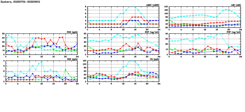 | Air Quality Data Time Series in Eastern (2022/08/03) | ( Line colors: Day -3 Day -2 Day -1 Current day ) | 2D Map Current AQHI |