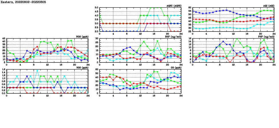 | Air Quality Data Time Series in Eastern (2022/08/05) | ( Line colors: Day -3 Day -2 Day -1 Current day ) | 2D Map Current AQHI |