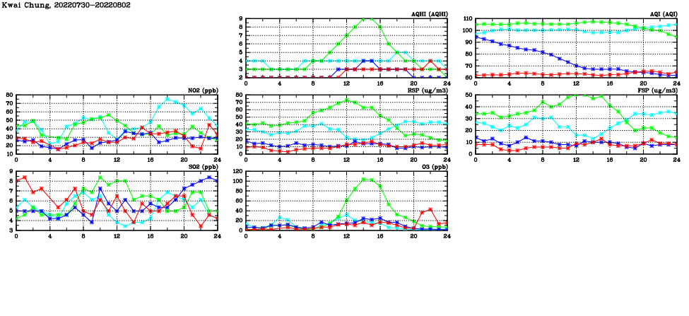 | Air Quality Data Time Series in Kwai Chung (2022/08/02) | ( Line colors: Day -3 Day -2 Day -1 Current day ) | 2D Map Current AQHI |