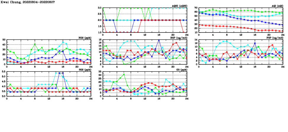 | Air Quality Data Time Series in Kwai Chung (2022/08/07) | ( Line colors: Day -3 Day -2 Day -1 Current day ) | 2D Map Current AQHI |