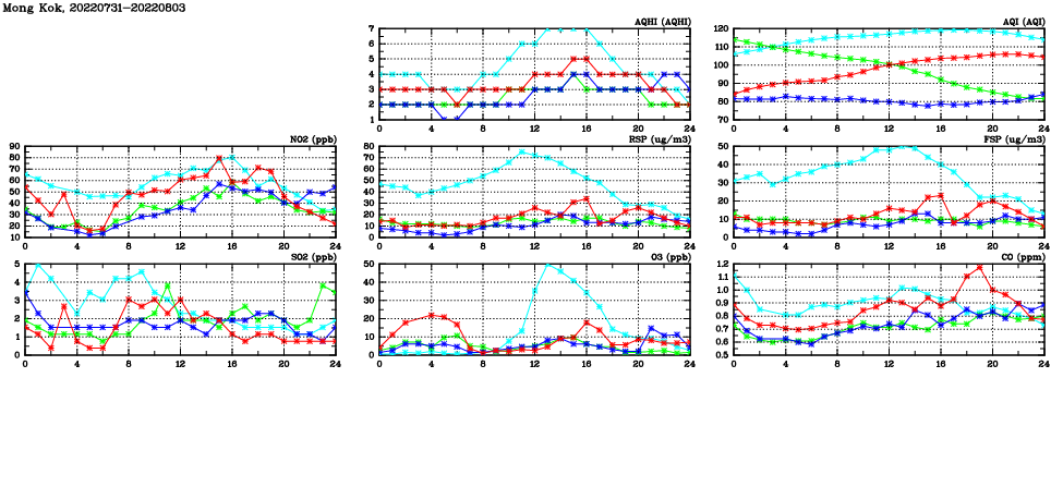 | Air Quality Data Time Series in Mong Kok (2022/08/03) | ( Line colors: Day -3 Day -2 Day -1 Current day ) | 2D Map Current AQHI |
