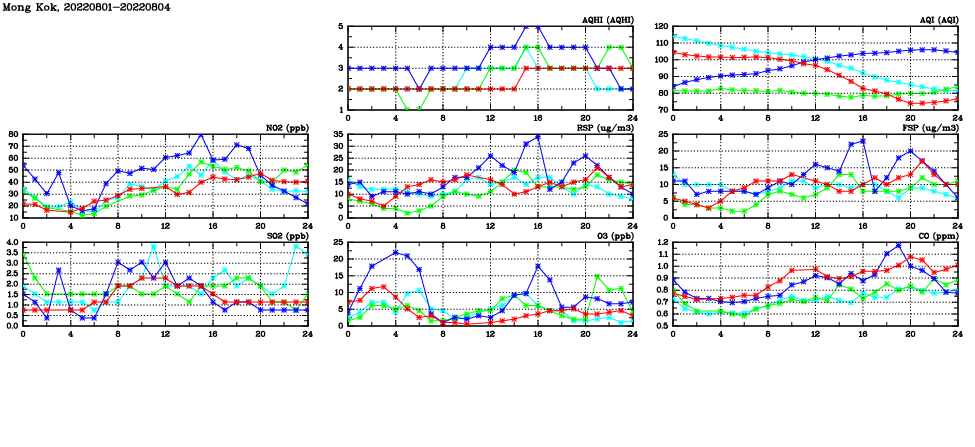 | Air Quality Data Time Series in Mong Kok (2022/08/04) | ( Line colors: Day -3 Day -2 Day -1 Current day ) | 2D Map Current AQHI |