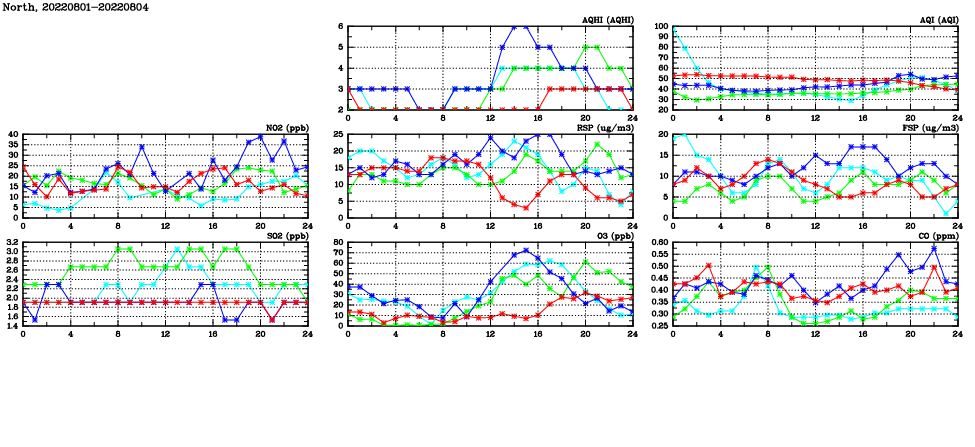 | Air Quality Data Time Series in North (2022/08/04) | ( Line colors: Day -3 Day -2 Day -1 Current day ) | 2D Map Current AQHI |