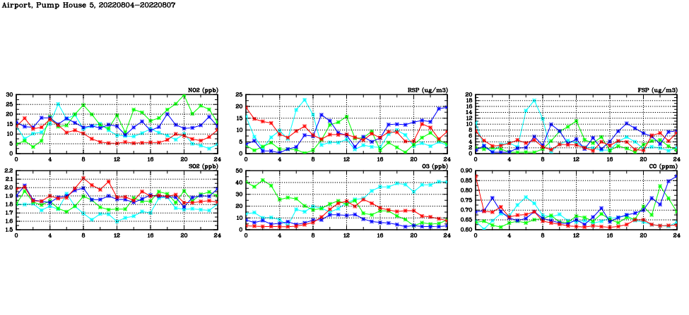 | Air Quality Data Time Series in Airport, Pump House 5 (2022/08/07) | ( Line colors: Day -3 Day -2 Day -1 Current day ) | 2D Map Current AQHI |