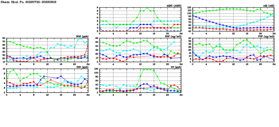 | Air Quality Data Time Series in Sham Shui Po (2022/08/02) | ( Line colors: Day -3 Day -2 Day -1 Current day ) | 2D Map Current AQHI |
