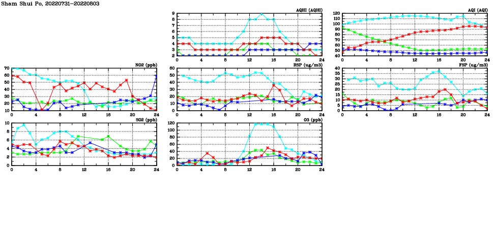 | Air Quality Data Time Series in Sham Shui Po (2022/08/03) | ( Line colors: Day -3 Day -2 Day -1 Current day ) | 2D Map Current AQHI |