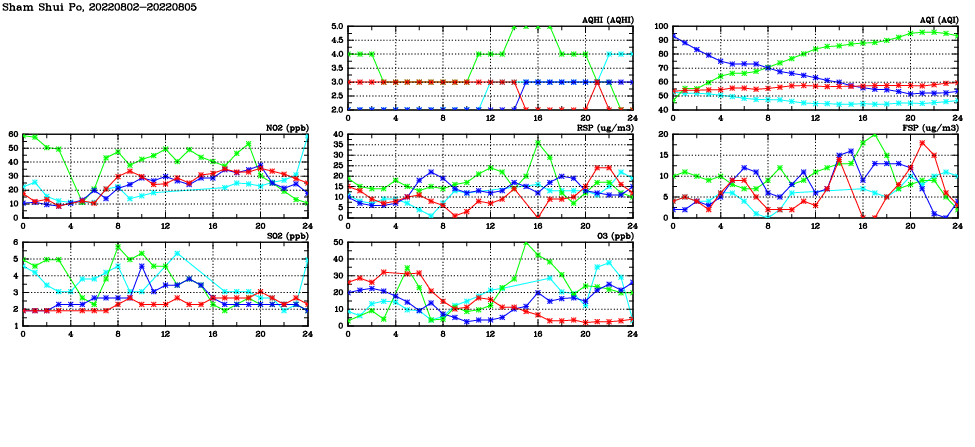 | Air Quality Data Time Series in Sham Shui Po (2022/08/05) | ( Line colors: Day -3 Day -2 Day -1 Current day ) | 2D Map Current AQHI |