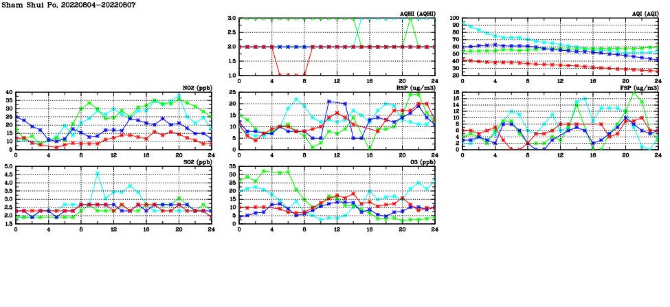 | Air Quality Data Time Series in Sham Shui Po (2022/08/07) | ( Line colors: Day -3 Day -2 Day -1 Current day ) | 2D Map Current AQHI |
