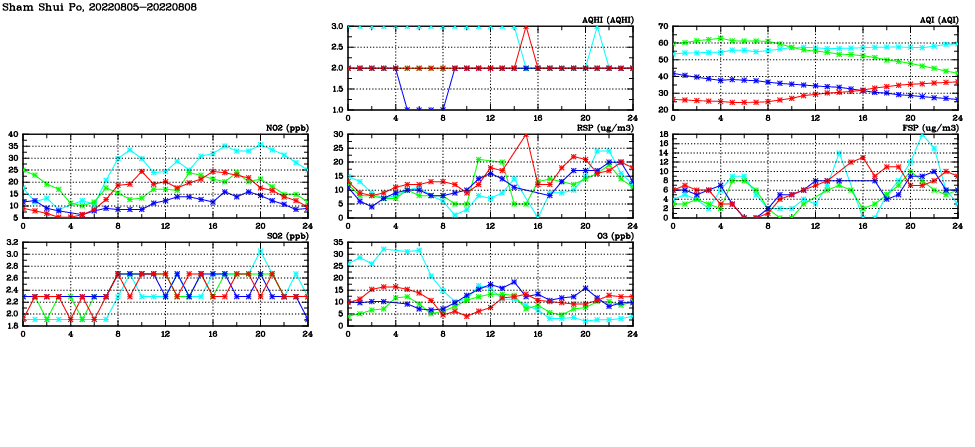 | Air Quality Data Time Series in Sham Shui Po (2022/08/08) | ( Line colors: Day -3 Day -2 Day -1 Current day ) | 2D Map Current AQHI |