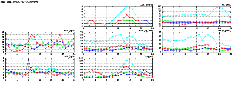 | Air Quality Data Time Series in Sha Tin (2022/08/03) | ( Line colors: Day -3 Day -2 Day -1 Current day ) | 2D Map Current AQHI |
