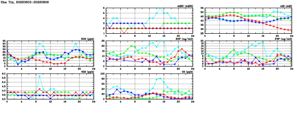 | Air Quality Data Time Series in Sha Tin (2022/08/06) | ( Line colors: Day -3 Day -2 Day -1 Current day ) | 2D Map Current AQHI |