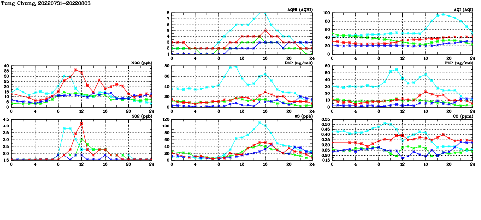 | Air Quality Data Time Series in Tung Chung (2022/08/03) | ( Line colors: Day -3 Day -2 Day -1 Current day ) | 2D Map Current AQHI |