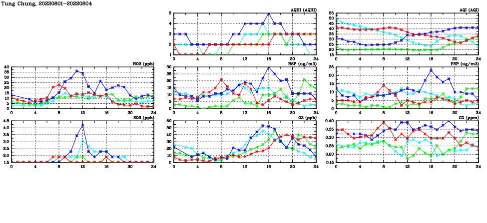 | Air Quality Data Time Series in Tung Chung (2022/08/04) | ( Line colors: Day -3 Day -2 Day -1 Current day ) | 2D Map Current AQHI |