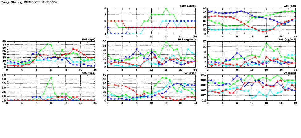 | Air Quality Data Time Series in Tung Chung (2022/08/05) | ( Line colors: Day -3 Day -2 Day -1 Current day ) | 2D Map Current AQHI |