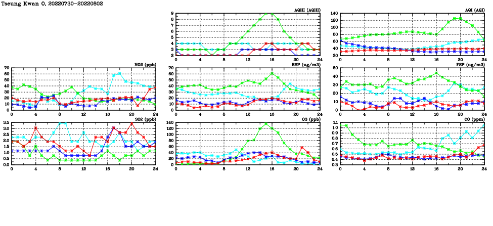 | Air Quality Data Time Series in Tseung Kwan O (2022/08/02) | ( Line colors: Day -3 Day -2 Day -1 Current day ) | 2D Map Current AQHI |