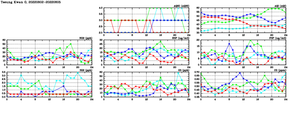 | Air Quality Data Time Series in Tseung Kwan O (2022/08/05) | ( Line colors: Day -3 Day -2 Day -1 Current day ) | 2D Map Current AQHI |