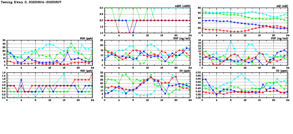| Air Quality Data Time Series in Tseung Kwan O (2022/08/07) | ( Line colors: Day -3 Day -2 Day -1 Current day ) | 2D Map Current AQHI |