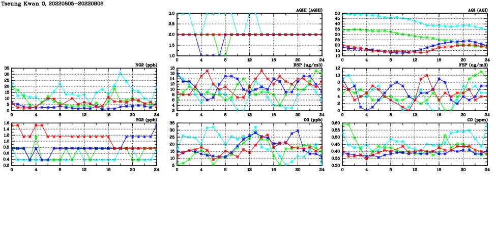 | Air Quality Data Time Series in Tseung Kwan O (2022/08/08) | ( Line colors: Day -3 Day -2 Day -1 Current day ) | 2D Map Current AQHI |