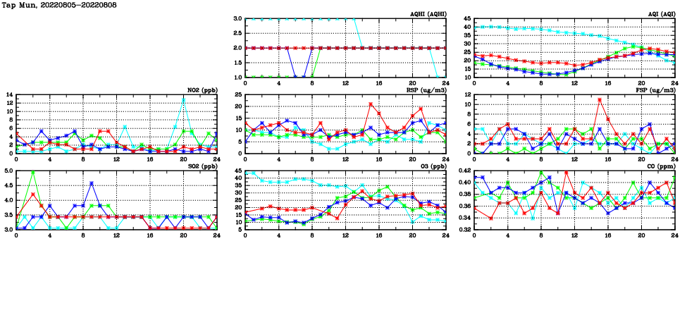 | Air Quality Data Time Series in Tap Mun (2022/08/08) | ( Line colors: Day -3 Day -2 Day -1 Current day ) | 2D Map Current AQHI |