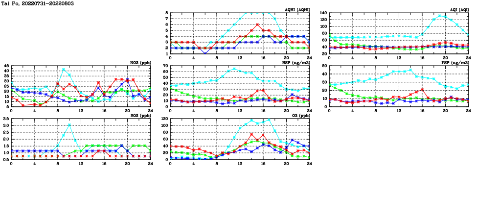 | Air Quality Data Time Series in Tai Po (2022/08/03) | ( Line colors: Day -3 Day -2 Day -1 Current day ) | 2D Map Current AQHI |