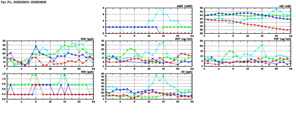 | Air Quality Data Time Series in Tai Po (2022/08/06) | ( Line colors: Day -3 Day -2 Day -1 Current day ) | 2D Map Current AQHI |