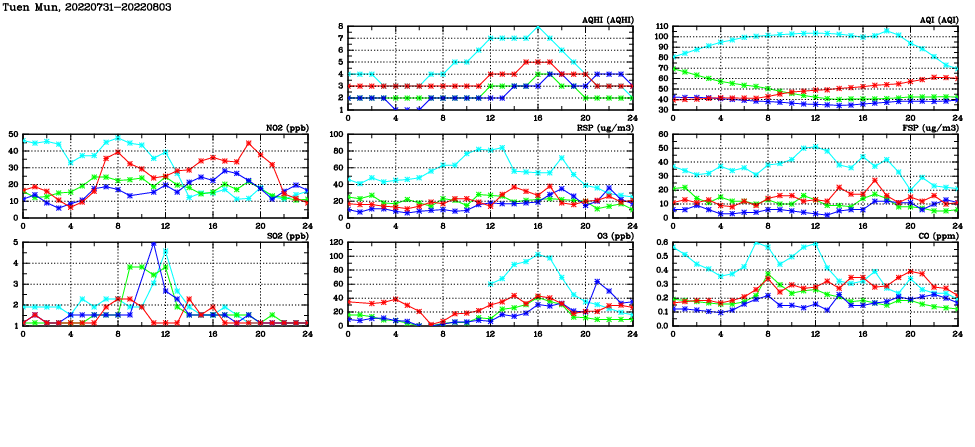 | Air Quality Data Time Series in Tuen Mun (2022/08/03) | ( Line colors: Day -3 Day -2 Day -1 Current day ) | 2D Map Current AQHI |