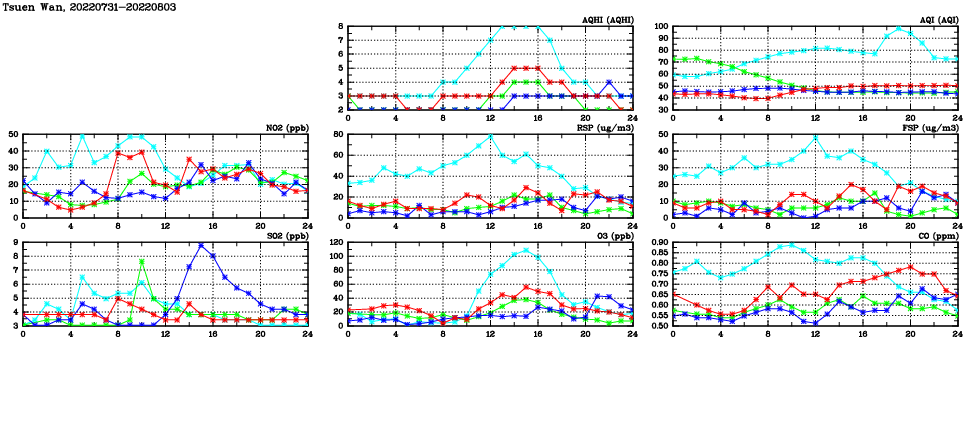 | Air Quality Data Time Series in Tsuen Wan (2022/08/03) | ( Line colors: Day -3 Day -2 Day -1 Current day ) | 2D Map Current AQHI |