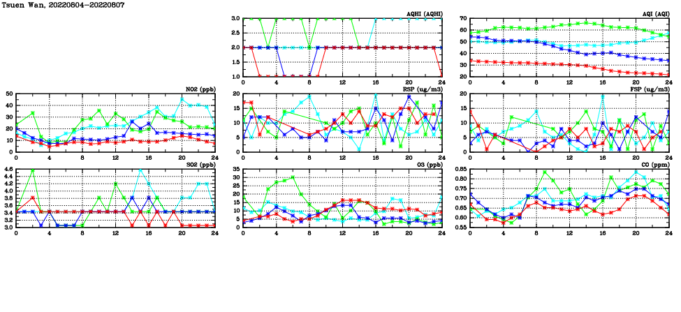 | Air Quality Data Time Series in Tsuen Wan (2022/08/07) | ( Line colors: Day -3 Day -2 Day -1 Current day ) | 2D Map Current AQHI |