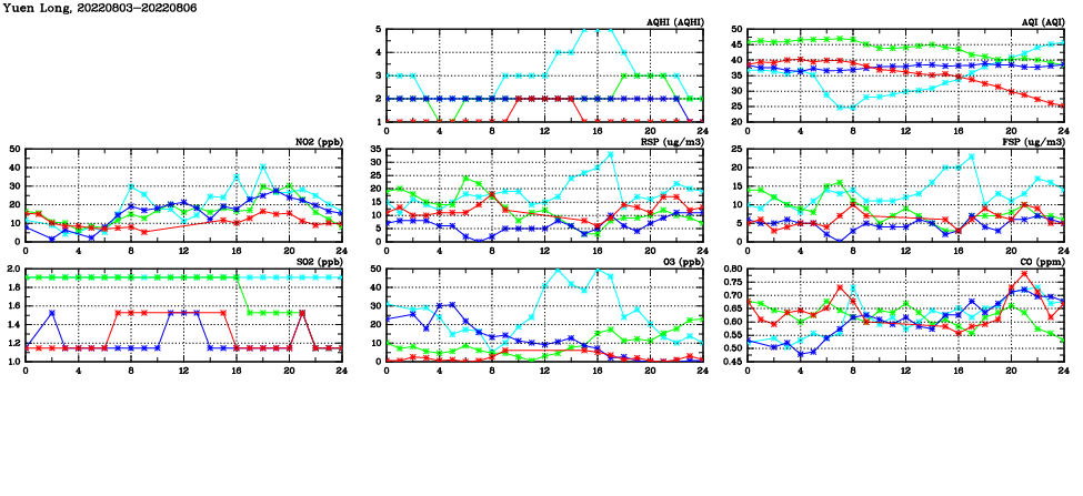 | Air Quality Data Time Series in Yuen Long (2022/08/06) | ( Line colors: Day -3 Day -2 Day -1 Current day ) | 2D Map Current AQHI |