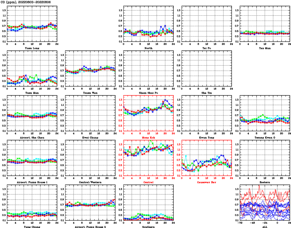 | Air Quality Data Time Series for CO (2022/08/06) | ( Line colors: Day -3 Day -2 Day -1 Current day ) | 2D Map Current AQHI |
