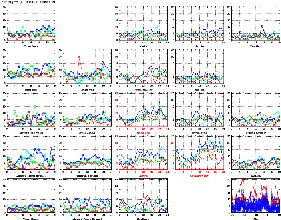 | Air Quality Data Time Series for FSP (2022/08/09) | ( Line colors: Day -3 Day -2 Day -1 Current day ) | 2D Map Current AQHI |