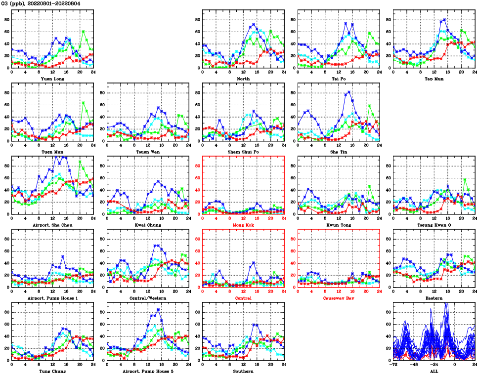 | Air Quality Data Time Series for O3 (2022/08/04) | ( Line colors: Day -3 Day -2 Day -1 Current day ) | 2D Map Current AQHI |