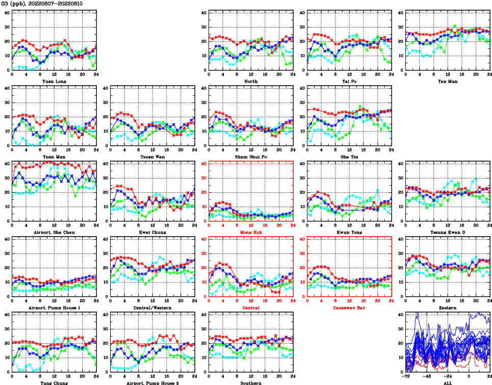 | Air Quality Data Time Series for O3 (2022/08/10) | ( Line colors: Day -3 Day -2 Day -1 Current day ) | 2D Map Current AQHI |