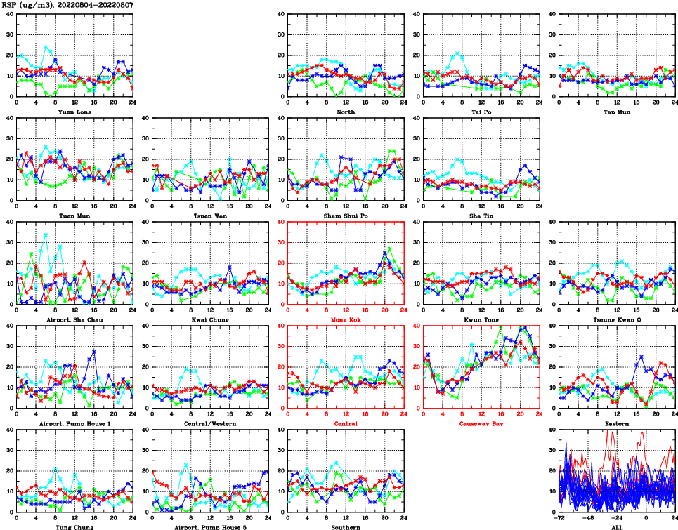 | Air Quality Data Time Series for RSP (2022/08/07) | ( Line colors: Day -3 Day -2 Day -1 Current day ) | 2D Map Current AQHI |
